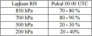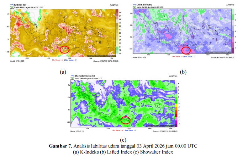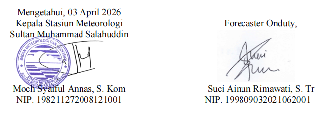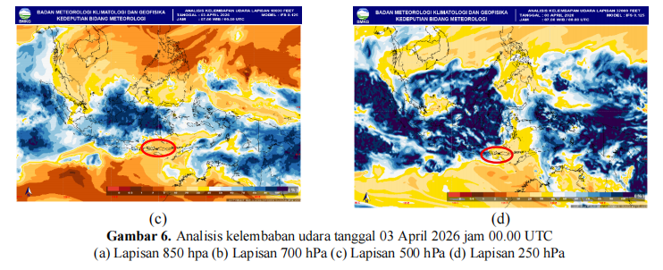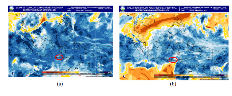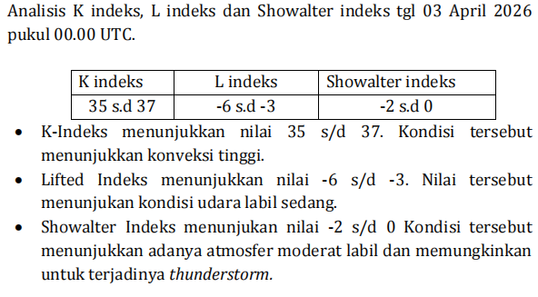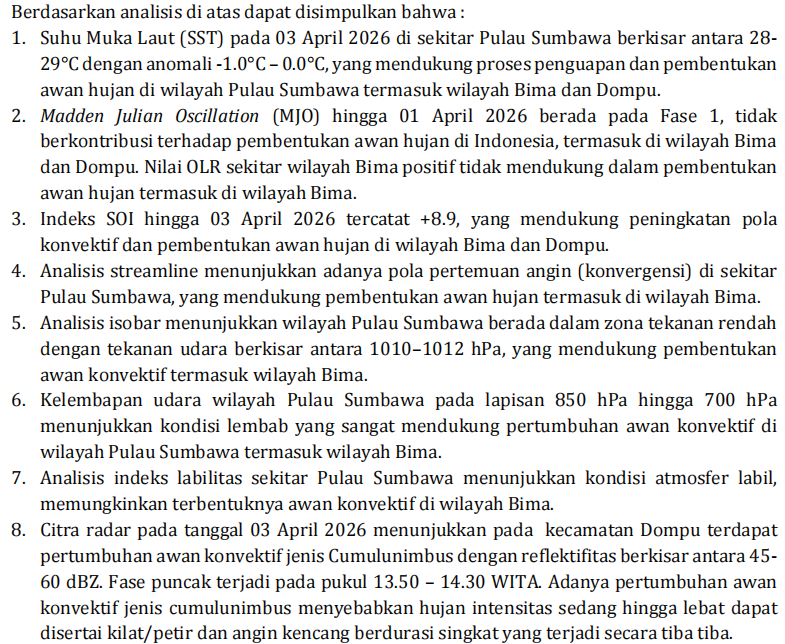 Berdasarkan data model kelembapan udara lapisan 850 hingga 200 hPa tanggal 03 April 2026 jam 00.00 UTC untuk wilayah sekitar Pulau Sumbawa sebagai berikut : ![]() kelembaban udara wilayah Pulau Sumbawa dalam kondisi basah dari lapisan 850 hingga 700 hPa dengan nilai 70%–90%. Kondisi tersebut mendukung pertumbuhan awan konvektif di wilayah sekitar Pulau Sumbawa termasuk wilayah Bima dan Bima. |