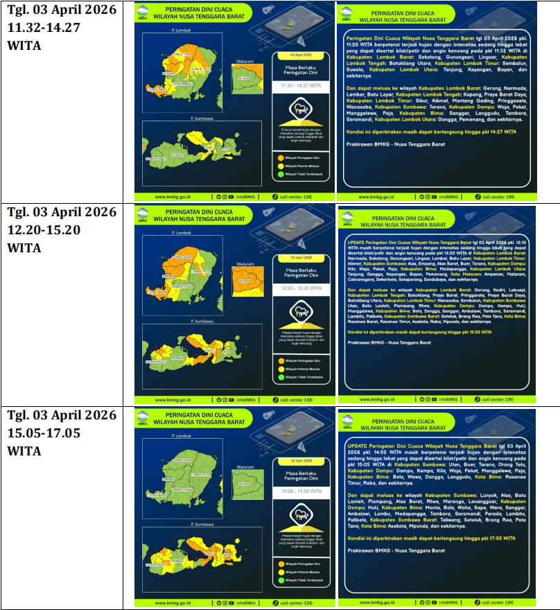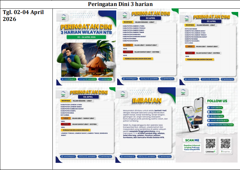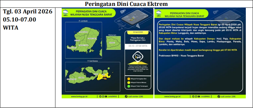 Untuk 1-3 hari ke depan, berpotensi terjadi hujan dalam intensitas sedang hingga lebat yang dapat disertai oleh kilat/petir dan angin kencang pada siang hingga sore hari di Kecamatan Tambora, Sanggar, Madapangga, Woha, Ambalawi, Palibelo, Belo, Woha, Soromandi, Donggo, Bolo, Monta, Parado, Pekat, Kempo, Dompu, Kilo, Woja, Manggalewa, Pajo, Hu'u, Asakota, Rasana'e Barat, Mpunda, Raba, Rasanae Timur. |