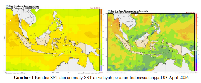 Data model Sea Surface Temperature (SST) terakhir menunjukkan bahwa pada tanggal 01 April 2026 suhu muka laut wilayah perairan di sekitar pulau Sumbawa berada dalam kondisi hangat dengan suhu berkisar antara 28 - 29 °C dengan anomaly suhu permukaan laut -1.0 °C s.d 0.0 °C. Kondisi ini mempengaruhi pertumbuhan awan konvektif di Wilayah Bima dan Dompu. |