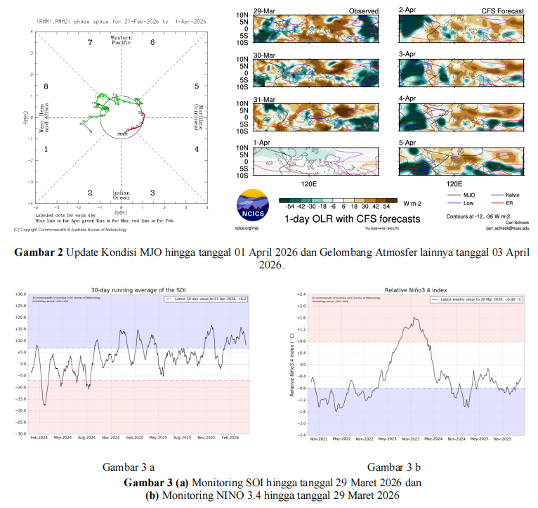Nilai Indeks Osilasi Selatan ( SOI ) hingga tgl 29 Maret 2026 adalah +8.9 (signifikan > +7) sehingga berpengaruh terhadap peningkatan pola konvektif di sebagian wilayah Indonesia bagian tengah dan timur. Nilai Indeks ENSO di NINO3.4 hingga tanggal 29 Maret 2026 adalah -0.42 (normal ±0.8) sehingga tidak berpengaruh terhadap peningkatan pola konvektif di sebagian wilayah Indonesia. |