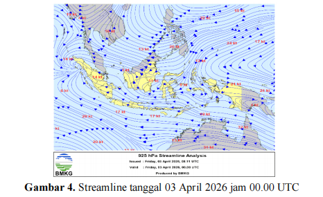 Berdasarkan analisis streamline lapisan 925 hpa tanggal 03 April 2026 pukul 00.00 UTC, terbentuk pola konvergensi angin di sekitar wilayah Pulau Sumbawa. Hal ini menyebabkan terkonsenterasinya massa udara basah di sekitar Pulau Sumbawa yang mendukung pembentukan awan hujan termasuk di wilayah Bima dan Dompu. |