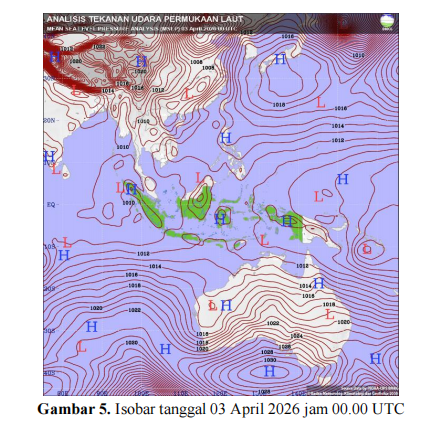 Analisis terhadap isobar tgl 03 April 2026 jam 00 UTC menunjukan wilayah Pulau Sumbawa berada dalam zona tekanan rendah dengan tekanan udara berkisar antara 1010 hPa hingga 1012 hPa. Kondisi ini mendukung peningkatan potensi pembentukan awan hujan di wilayah Bima dan Bima. |