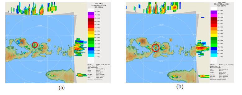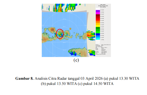 Berdasarkan citra radar cuaca Bima pada tanggal 03 April 2026, menunjukan pada pukul 13.30 WITA terpantau adanya pertumbuhan awan konvektif disekitar wilayah Kecamatan Dompu. Pertumbuhan awan konvektif semakin meningkat dan mencapai fase puncak awan terjadi pada pukul 13.50-14.30 WITA. Pada fase ini nilai reflektifitas awan mencapai maksimum 50-60 dBZ. Nilai tersebut menunjukan adanya pertumbuhan awan konvektif jenis cumulonimbus pada wilayah tersebut. Awan ini menghasilkan hujan intensitas sedang hingga lebat disertai kilat/petir dan angin kencang berdurasi singkat yang terjadi secara tiba tiba. Awan luruh pada pukul 14.40-14.50 WITA dan luruh sempurna pada pukul 15.00 WITA. Berdasarkan citra radar cuaca Bima pada tanggal 03 April 2026, pada pukul 13.30 WITA terpantau awal pertumbuhan awan konvektif di sekitar wilayah Kecamatan Dompu yang mengalami siklus hidup singkat, dan dengan cepat mencapai fase puncak pada pukul 13.50-14.30 WITA. Pada fase ini, nilai reflektivitas awan mencapai maksimum 50-60 dBZ, disertai munculnya indikasi pola tight low-level gradient (gradien reflektivitas yang sangat rapat) pada sel awan. Pola ini menandakan terjadinya downdraft, sehingga memicu dampak berupa hujan intensitas sedang hingga lebat yang disertai kilat/petir, serta hembusan angin kencang berdurasi singkat yang terjadi secara tiba-tiba (downburst). Fase disipasi sel awan kemudian terjadi pada pukul 14.40-14.50 WITA, hingga luruh sempurna pada pukul 15.00 WITA. |
