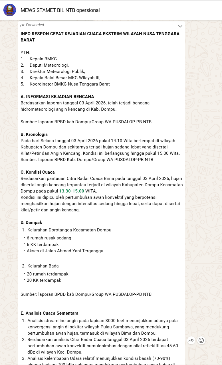 Bangunan Rusak, Gangguan Transportasi B. Kronologis Pada hari Selasa tanggal 03 April 2026 pukul 14.10 Wita bertempat di wilayah Kabupaten Dompu dan sekitarnya terjadi hujan sedang-lebat yang disertai Kilat/Petir dan Angin Kencang. Kondisi ini berlangsung hingga pukul 15.00 Wita. Sumber: laporan BPBD Kab. Dompu/Group WA PUSDALOP-PB NTB C. Kondisi Cuaca Berdasarkan pantauan Citra Radar Cuaca Bima pada tanggal 03 April 2026, hujan disertai angin kencang terpantau terjadi di wilayah Kabupaten Dompu Kecamatan Dompu pada pukul 13.30-15.00 WITA. Kondisi ini dipicu oleh pertumbuhan awan konvektif yang berpotensi menghasilkan hujan dengan intensitas sedang hingga lebat, serta dapat disertai kilat/petir dan angin kencang. D. Dampak 1. Kelurahan Dorotangga Kecamatan Dompu - 6 rumah rusak sedang - 6 KK terdampak - Akses di Jalan Ahmad Yani Terganggu 2. Kelurahan Bada - 20 rumah terdampak - 20 KK terdampak Sumber: laporan BPBD kab Dompu/Group WA PUSDALOP-PB NTB |