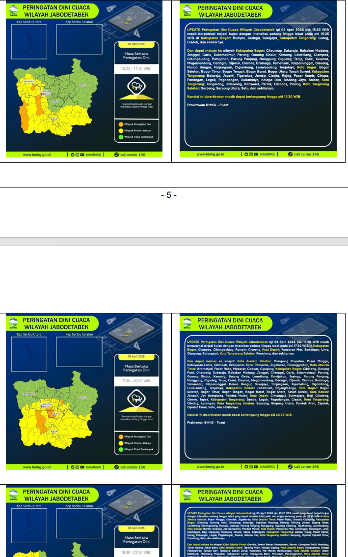 lebat di wilayah Provinsi Banten masih berpeluang terjadi hingga tiga hari ke depan (4-6 April 2026). Sedangkan untuk wilayah Tangerang Selatan potensi hujan sedang – lebat berpeluang terjadi dua hari kedepan (4-5 April 2026). Dengan mempertimbangkan dinamika atmosfer yang masih aktif dan potensi dampak yang dapat ditimbulkan, masyarakat dihimbau untuk tetap siaga dan tanggap terhadap informasi peringatan dini yang dikeluarkan oleh BMKG. |