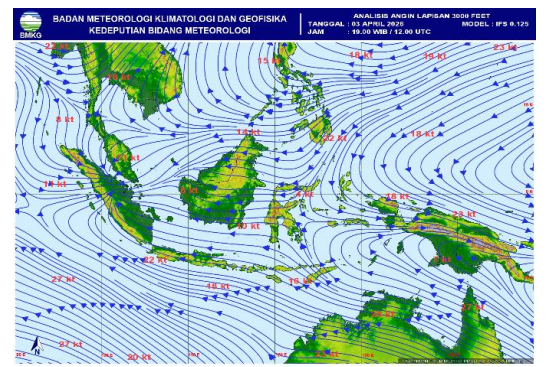 Berdasarkan peta analisis angin tanggal 3 April 2026 pada