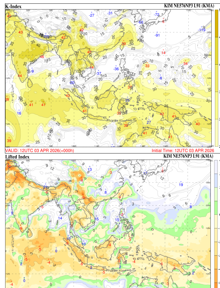 tanggal 3 April 2026 jam 12 UTC, terpantau nilai K-Index (KI) sebesar 35 hingga 40, Lifted Index (LI) bernilai -2 hingga -3, dan indeks SI bernilai 0 hingga -1 dimana parameter indeks labilitas udara terpantau sama di seluruh wilayah Banten. Nilai K-Index di atas 30 mengindikasikan potensi - 5 - pembentukan awan hujan yang tinggi, sementara Lifted Index (LI) bernilai negatif mengindikasi proses pengangkatan udara yang kuat ke lapisan atas. |