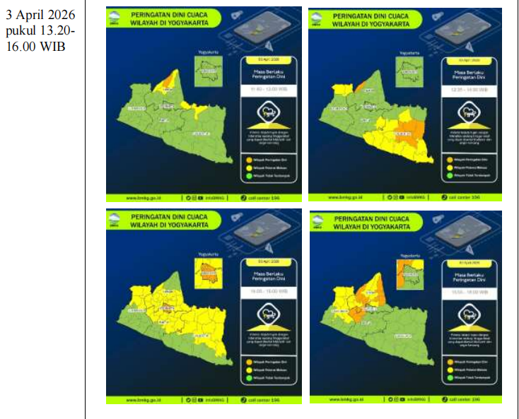 menunjukkan potensi hujan dengan intensitas sedang-lebat dapat disertai kilat/petir dan angin kencang dominan pada siang hingga sore hari dapat terjadi di wilayah utara DIY. |