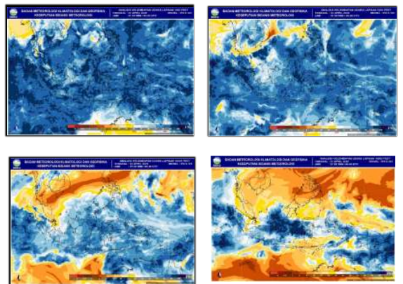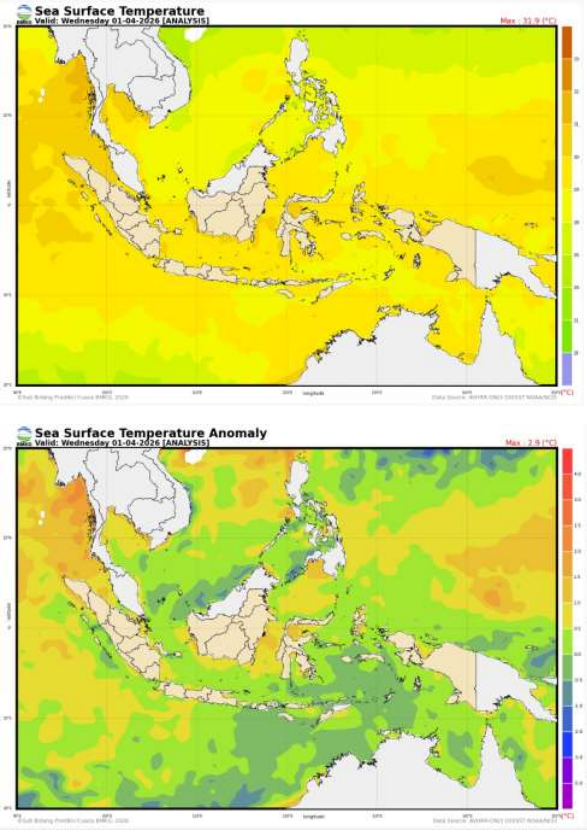 tanggal 3 April 2026 mengindikasikan suhu muka laut umumnya relatif hangat (29-30 C) dengan anomali sebesar 0.0 – 1.0 C, sehingga menunjukkan potensi penguapan yang relative tinggi untuk mendukung pertumbuhan awan-awan konvektif. |