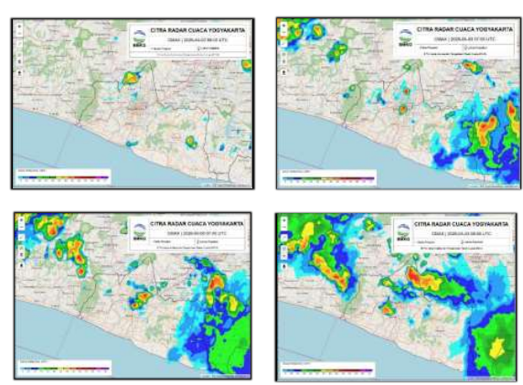 adanya pertumbuhan awan-awan hujan di Kab. Gunungkidul dan Kab. Sleman, awan konvektif mulai muncul dan tumbuh di sebelah timur DIY lalu berkembang dan meluas ke seluruh wilayah DIY terutama wilayah utara DIY. Berdasarkan verifikasi warna legend radar, maka pada jam tersebut menunjukkan hujan intensitas sedang - lebat yang dapat disertai kilat/petir dan angin kencang. |