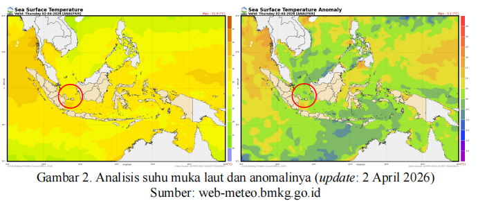 perairan Indonesia relatif hangat termasuk di sekitar wilayah Kep. Bangka Belitung yang berada pada rentang 29 - 31 oC dengan anomali suhu antara 0.0-1 oC (anomali positif). Kondisi tersebut mengindikasikan suplai uap air ke wilayah Kep. Bangka Belitung mendukung pertumbuhan awan-awan di wilayah tersebut. |