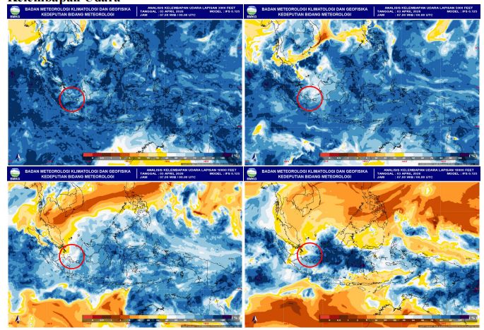 spasial terpantau berada di sebagian besar wilayah Indonesia bagian Barat termasuk Kep. Bangka Belitung ditambah dengan aktifnya gelombang Rossby Ekuatorial di sekitar wilayah Kep. Bangka Belitung yang menambah potensi pembentukan awan hujan di Kep. Bangka Belitung. |