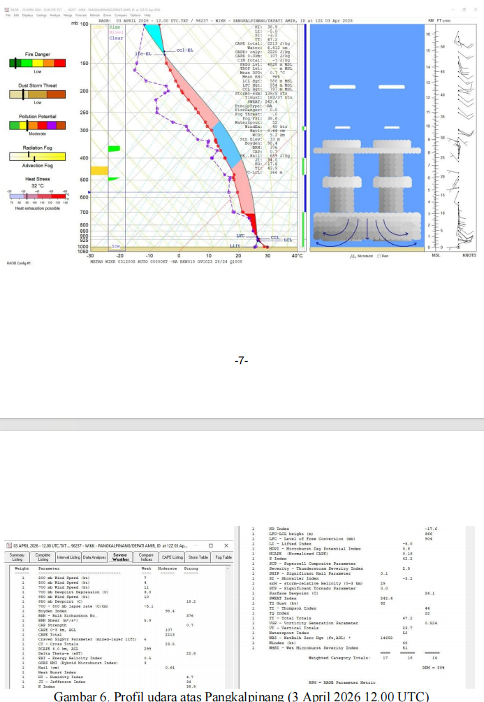 radiosonde (Gambar 6) menunjukkan indeks labilitas atmosfer pada berbagai parameter yang bervariasi termasuk dari kategori sedang hingga kuat. Kondisi tersebut mengindikasikan adanya potensi-3- terbentuknya awan-awan konvektif yang kuat serta potensi thunderstorm yang cukup besar di sekitar wilayah pengamatan termasuk Kep. Bangka Belitung secara umum. INDEKS Nilai (Kategori) CAPE 47.6 (sedang) KI 38.9 (kuat) SI -3.2 (sedang) LI -5.0 (sedang) |