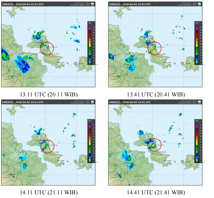 pertumbuhan sel awan dimulai di lokasi kejadian pada pukul 13.11 UTC dengan reflektivitas 30 - 50 dBZ. Awan cumulonimbus di lokasi kejadian mencapai reflektivitas maksimumnya sekitar pukul 13.41 hingga 15.41 UTC dengan nilai reflektivitas mencapai 50 dBz dan mulai menurun reflektifitasnya pada 16.11 UTC yaitu sebesar 10-20 dBz. |