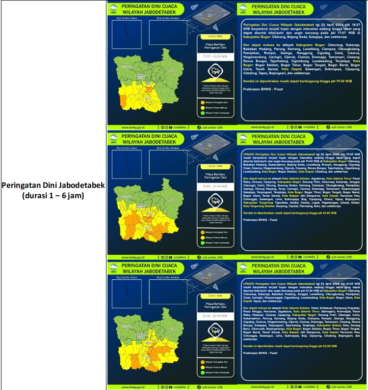 dengan kilat atau petir dan juga angin kencang pada sore hari, terutama pada hari dimana terjadi pemanasan kuat antara pukul 10.00 hingga 14.00 WIB, biasanya ditandai dengan jenis awan yang berwarna gelap, dan menjulang tinggi seperti kembang kol dan terkadang memiliki landasan pada puncaknya (Awan jenis Cumulonimbus). 2. Waspada terhadap potensi sambaran petir dengan berlindung di tempat tertutup, menghindari pohon, tiang listrik, reklame, atau sesuatu yang tinggi lainnya yang bisa roboh saat terjadi angin kencang, menghindari tempat tinggi dan terbuka, mematikan alat komunikasi sementara waktu, dan menjaga jarak aman jika sedang berteduh di luar ruangan. 3. Khusus untuk daerah bertopografi curam/bergunung atau rawan longsor agar tetap waspada khususnya pada kejadian hujan dengan intensitas ringan hingga lebat yang terjadi selama beberapa hari berturut- turut. Pada daerah dataran rendah dan dekat aliran sungai, untuk mewaspadai potensi genangan/banjir. 4. Diprakirakan satu hingga tiga hari ke depan masih terdapat potensi hujan (pada skala lokal) pada siang hingga malam hari di sebagian wilayah Kota Bogor. |