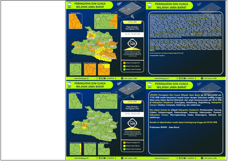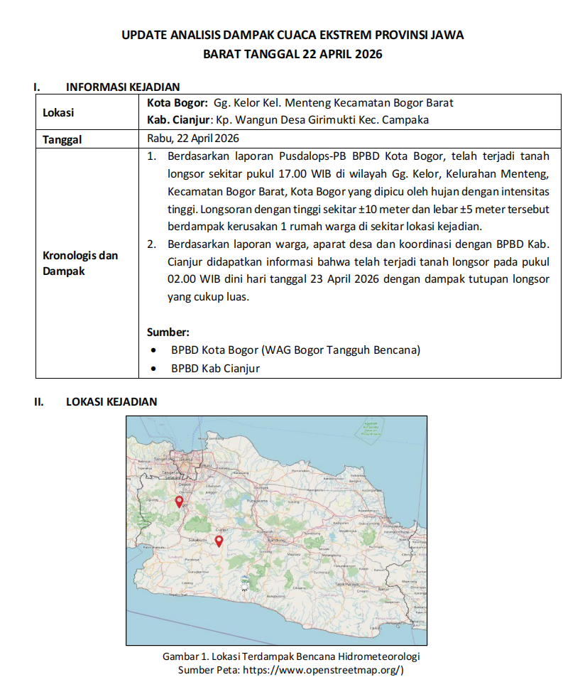 dipengaruhi oleh suhu muka laut di sebagian wilayah perairan Indonesia masih relatif hangat yang mengindikasikan potensi suplai uap air ke wilayah Jawa Barat, terpantau daerah belokan angin di sekitar wilayah Jawa Barat, kondisi tersebut mendukung potensi pembentukan awan konvektif di sebagian wilayah Jawa Barat, serta kelembapan relatif pada lapisan 850 -500 mb berada pada rentang 50 - 95%. Faktor lokal yakni labilitas atmosfer bervariasi pada kategori ringan hingga kuat yang mengindikasikan meningkatnya potensi terbentuknya awan konvektif skala lokal. 2. Berdasarkan interpretasi citra radar terdapat indikasi terjadinya hujan sedang hingga lebat pada skala lokal di sebagian wilayah Kota Bogor pada rentang waktu antara sore hingga malam hari. Sedangkan pada sore hingga malam hari terjadi hujan sedang hingga lebat di sebagian wilayah Kabupaten Cianjur. 3. Pada periode transisi kejadian hujan lebat disertai angin kencang dapat bersifat lokal, mengingat pos pengataman otomatis terdekat berjarak kurang lebih 15 Km, namun berdasarkan data hujan pada tanggal 19 – 21 April 2026 terpantau hujan berturut – turut di sekitar Kota Bogor bagian barat dengan intensitas ringan hingga saat lebat, pada kejadian berdampak longsor kondisi tersebut mendukung tanah menjadi lebih lembab dan jenuh. 4. Berdasarkan data curah hujan dan peta analisis curah hujan tanggal 19-22 April 2026 menunjukkan akumulasi curah hujan selama empat hari berturut-turut, dimana membuat pori pori tanah terus terisi penuh oleh air sehingga mengurangi gaya gesek antar partikel tanah (kohesi). Kombinasi intensitas tinggi curah hujan dan durasi paparan yang lama mengakibatkan penjenuhan tanah yang luas, sehingga berdampak longsor yang cukup masif di dini hari. |