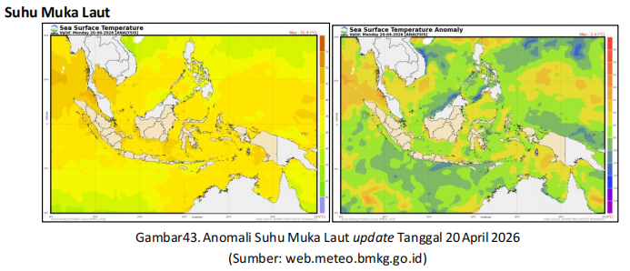 Suhu muka laut di sebagian wilayah perairan Indonesia masih relatif hangat, mengindikasikan potensi suplai uap air ke wilayah Jawa Barat