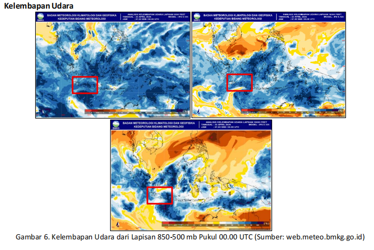 Kelembapan udara di wilayah Jawa Barat juga cukup tinggi, yakni pada lapisan 850–500 mb berada pada kisaran 40–98%