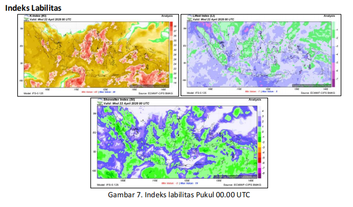 Labilitas atmosfer secara umum berada pada kategori ringan hingga sedang, yang mengindikasikan meningkatnya potensi terbentuknya awan konvektif skala lokal.